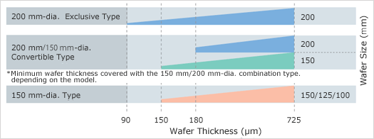 我們推出了200 mm專用型、200 mm/150 mm兼用型和150 mm型(對應小于150 mm的晶圓)的3種型號。除此以外,您還可以根據(jù)檢查模式,選用微觀檢查專用型號"L型"或微觀?宏觀檢查兼用型號"LMB型"。