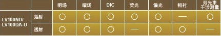 可支持多種觀察方法:明場(chǎng)、暗場(chǎng)、偏光、微分干涉、落射熒光和雙光束干涉測(cè)量觀察功能。此外,LV100DA和LV100DA-U還可提供透射型微分干涉、暗場(chǎng)、偏光和相襯觀察功能。